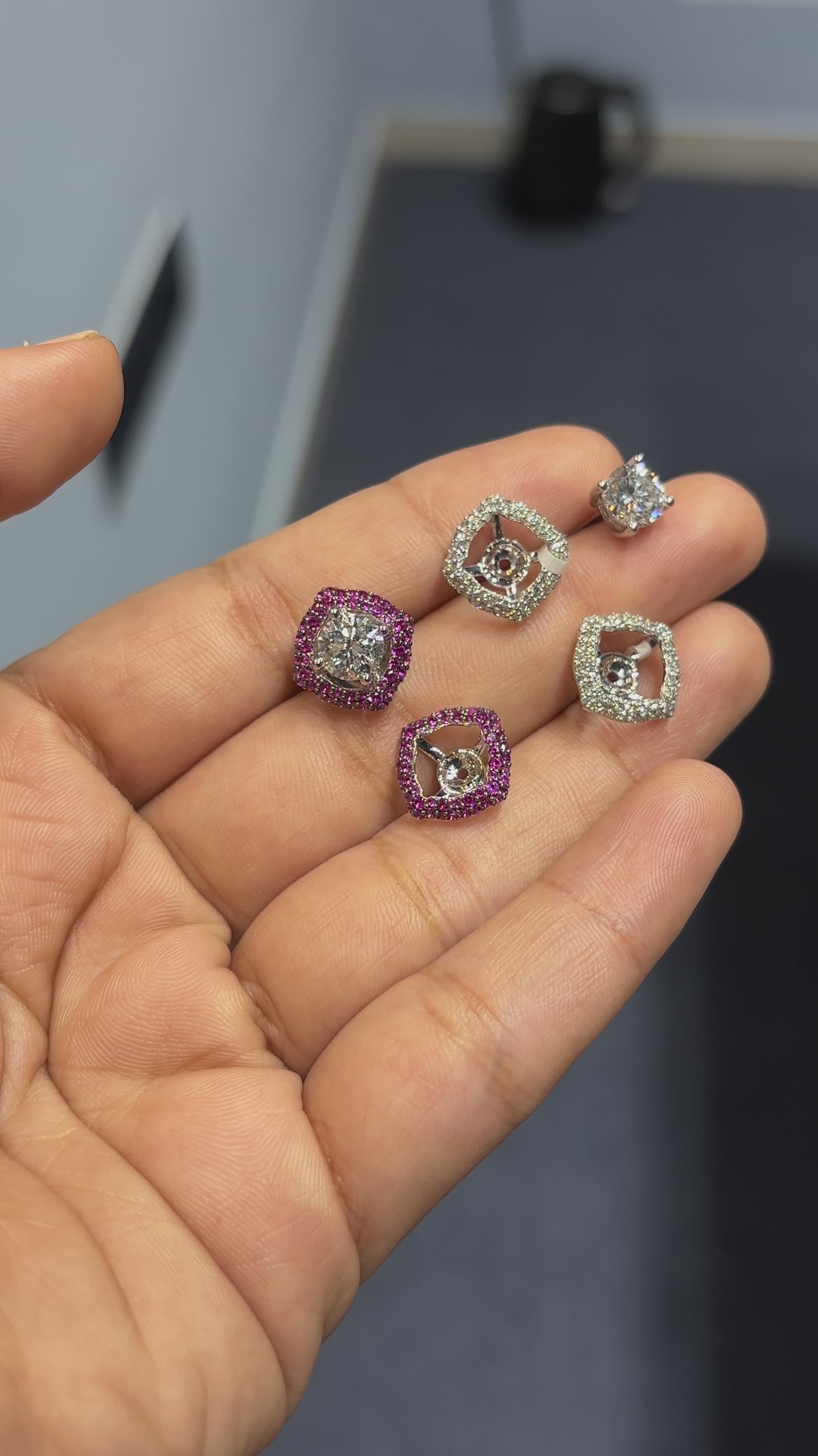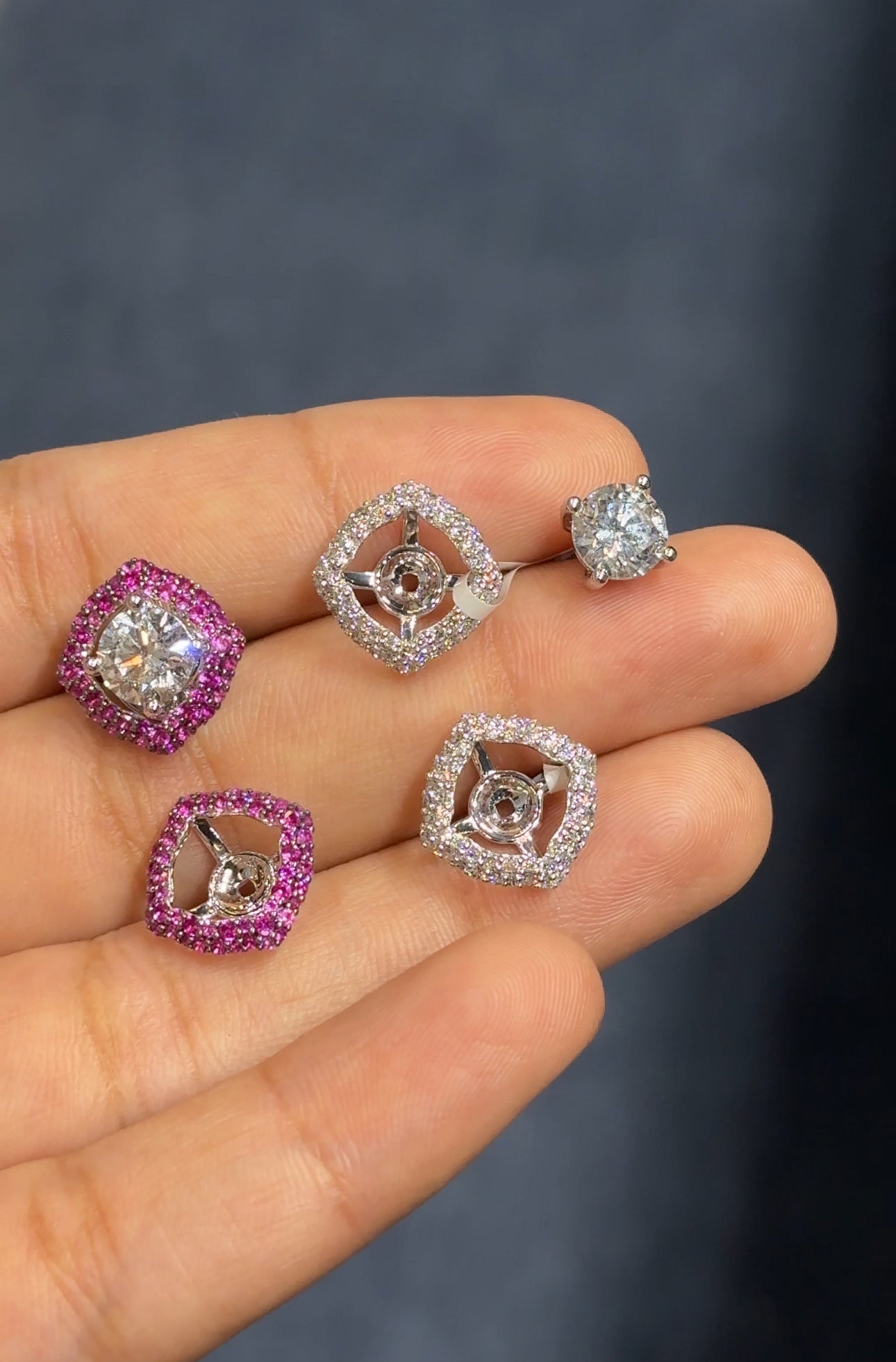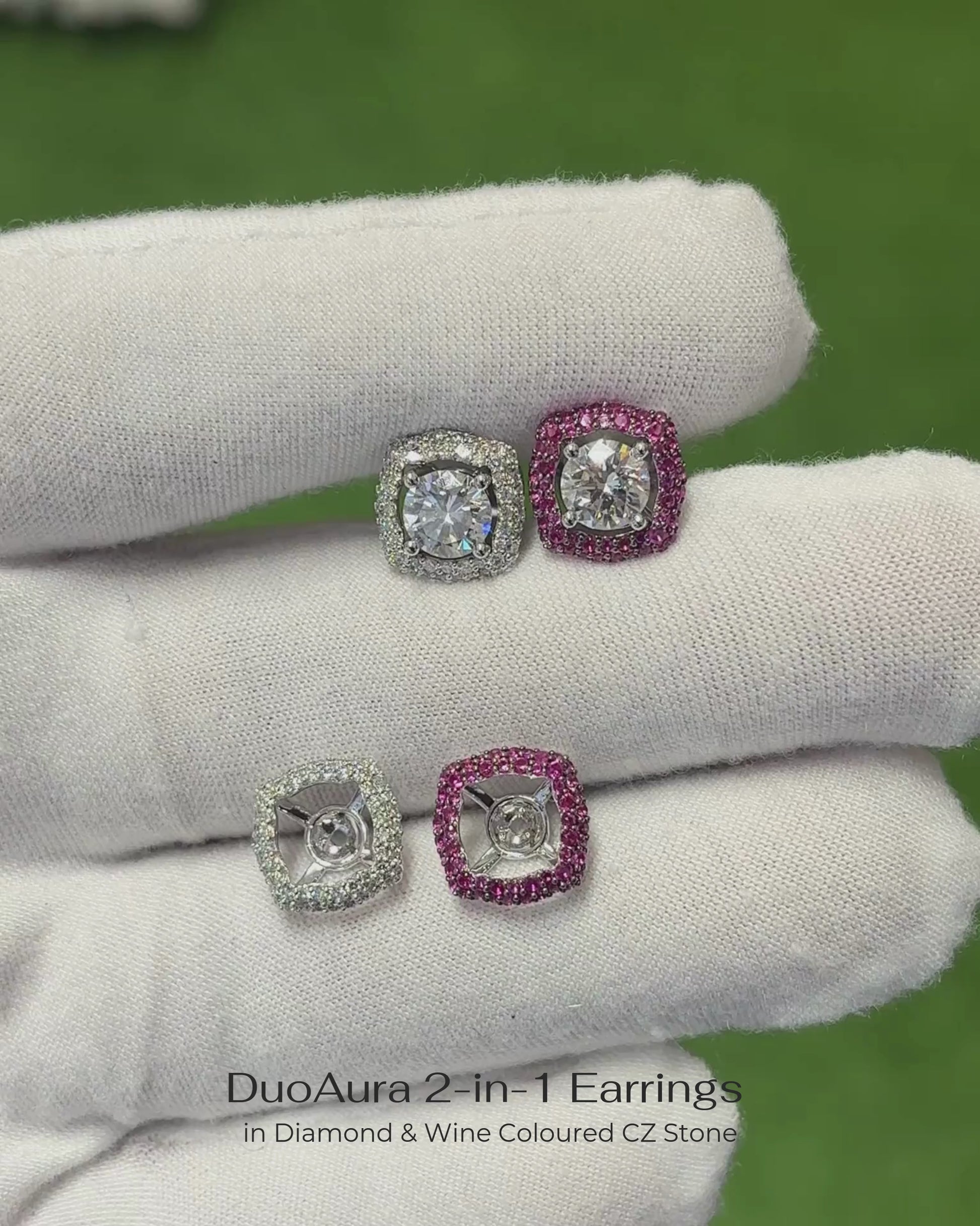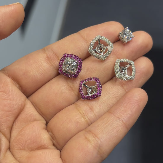 Versatile 2-in-1 solitaire earrings with interchangeable jackets. Crafted in 14K and 18K white gold with lab-grown diamonds and wine-colored CZ options.