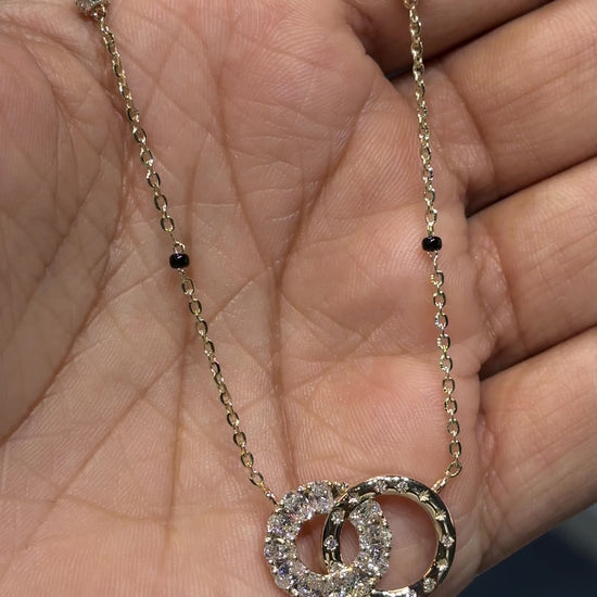 Discover the Eternal Link Mangalsutra, a classic reimagined. The interlocking rings symbolize strength and unity, while the delicate station chain adds a touch of feminine grace.