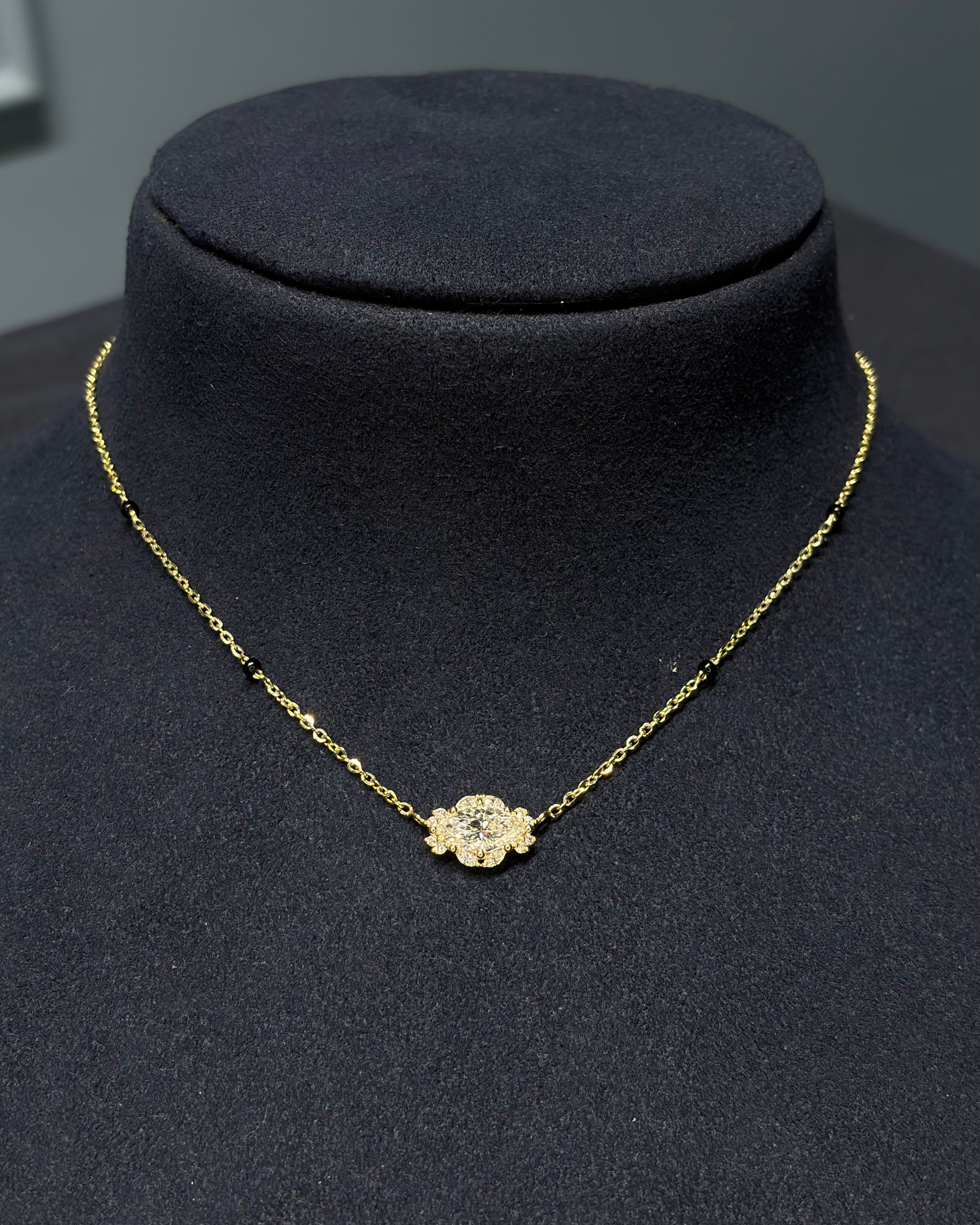 A vision of regal elegance, this Mangalsutra features a stunning horizontal Marquise Lab-Grown diamond centerpiece. The main stone is surrounded by a halo of smaller marquise and round diamonds, creating an eye-catching eye-shaped silhouette. Suspended on a chain with traditional black beads, it blends the protective significance of the Mangalsutra with the grandeur of a diamond solitaire.